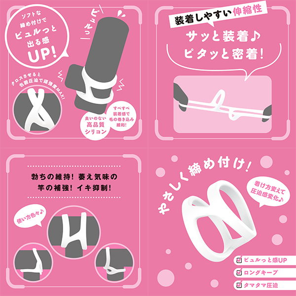 着け方を変えて圧迫感も変化♪自分好みの締め付けで、勃ちの維持!萎え気味の竿の補強!イキ抑制!クロスさせると包囲圧迫で頑強度MAXに!ソフトな締めつけでビュルっと出る感UP♪ゆ〜っくり夢心地発射!