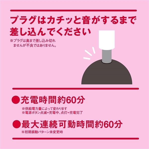 充電時間約60分(供給電力量によって変わります)最大連続稼働時間約60分(初期振動パターン未変更時)、付属品:USBフォーンプラグ式充電ケーブル