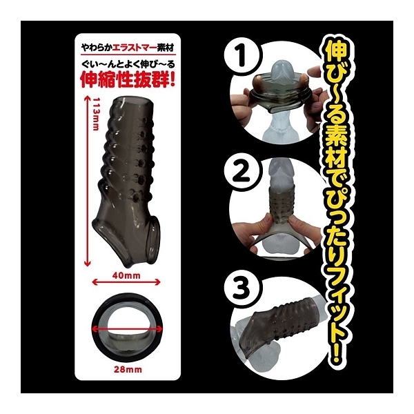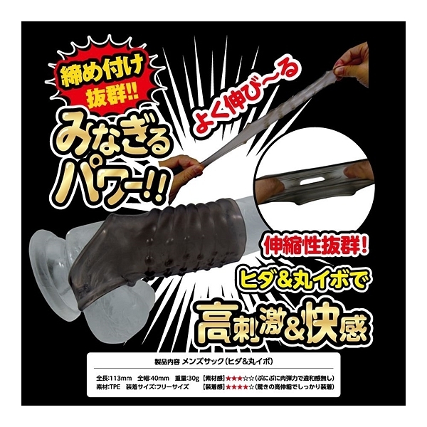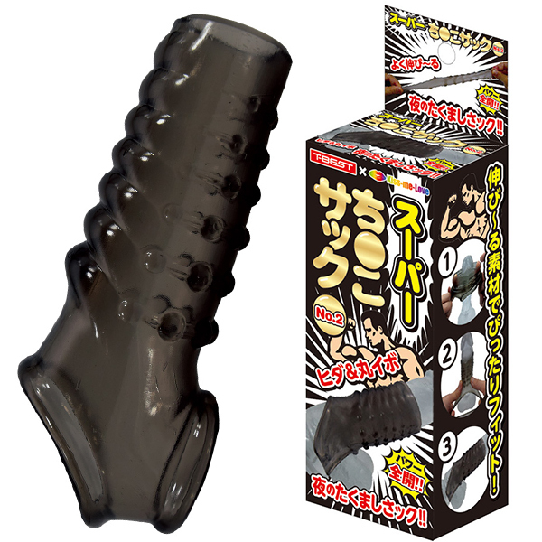 夜もがんばリング、で大人気のやわらかメンズリング「ち●こリング」シリーズに、スーパーなサックが新登場!今度のち●こサックは「ベースに装着するメンズサック」!ぷにぷにっとした柔らかなTPE(エラストマー)素材は、ぐい〜んとよく伸びる高伸縮性!サイズ問わずでどんな大きさでもしっかりフィットの抜群の装着感&締付感!さらに、ツンツンとしたトゲトゲ突起による高刺激快感が!男らしさを引き立たせるスモークカラー!「No.2」は、上下で刺激が異なるヒダ&丸イボ突起!上は擦るような段々腹ヒダのヒダ突起、下は抉るような丸イボ突起が、アナタをスーパーに変身させるはず!ほとばしるストロング、みなぎるパワー!