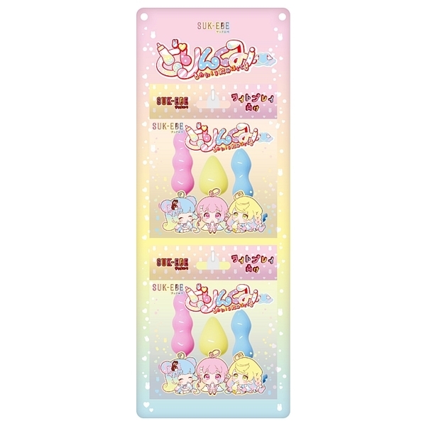 仕様:パッケージ:15.7×13.0×3.8cm 本体:ブルー(9.0×2.5cm)・イエロー(7.0×3.5cm)・ピンク(11.0×3.0cm)