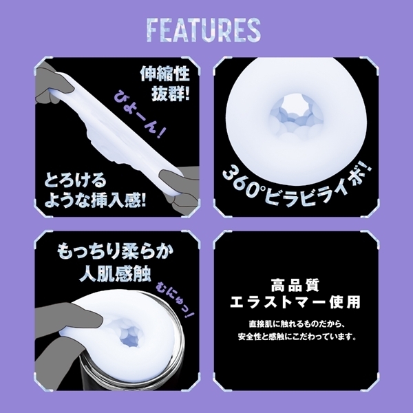 伸縮性抜群の柔らか素材が吸い付きながら絡みつく粘膜刺激!もっちり柔らか人肌感触の挿入口はリアルを超えた幸福快感!竿部分をダイレクトに刺激する360°ビラビライボの敏感刺激!最先端技術によりコンパクトなのにパワフル&多機能!インナーホールにもこだわった電動ホールです!静音設計≦60dB。