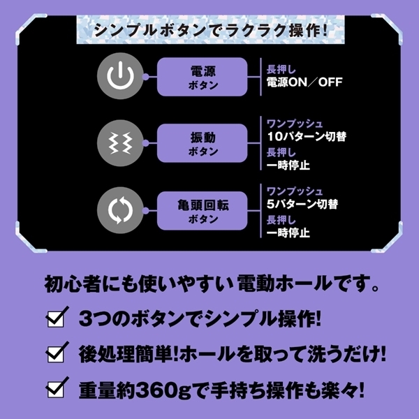 亀頭回転パワフル振動のハイクオリティ電動オナホが登場!一番敏感な亀頭に回転5パターン!竿部分には芯まで震えるヘビー級振動10パターン!全50バリエーション!異なる性感帯に最適な刺激を与える快感コンビネーション!高性能モーター搭載によりパワフルなのに静かな回転振動を実現しました。