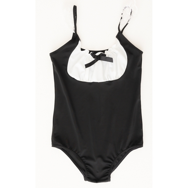 胸元の大きなリボンと締付けのないノンワイヤーでバストラインを自然で美しく魅せる、メイド風デザインの水着です。