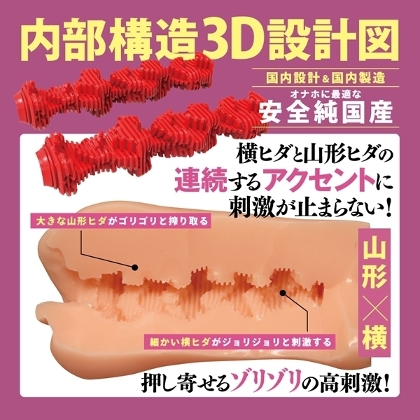 リアルな刺激を追求した非貫通型オナホールです♪重量370gの使いやすいサイズで、横ヒダと山形ヒダの連続構造が、ゾリゾリと高刺激を提供します。