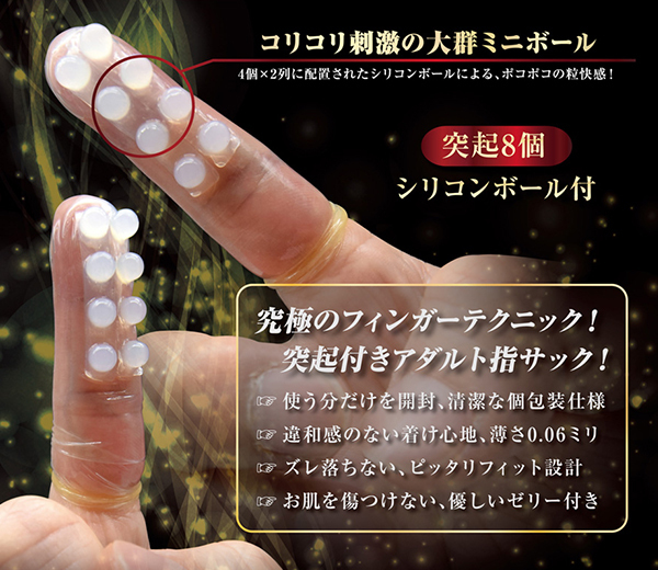 シリコン製のミニボールに突起が8個ついた指サックでクリトリスを愛撫したりアソコに挿入したりと使い方は自由自在!4個×2列に配置されたシリコンボールはアソコに挿入するとボコボコの粒快感♪6個入りで個包装されているので清潔にお使いいただけ、Gスポットをズリズリしたりと着けるだけでご自身の指技をグレードアップしてくれます!薄さはコンドームのような0.06mm。