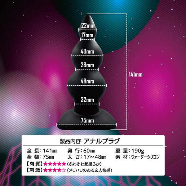 アナルビーズっぽい感覚で引き抜くときにも気持ちいい♪新素材のウォーターシリコンだから負担も少なくアナルの魅力を最大限まで満足させてくれます。
