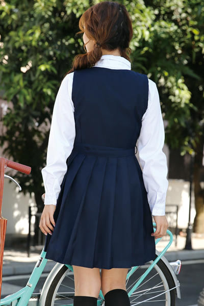 動けばヒラリと広がるプリーツ仕様のジャンパースカートに、丸襟の長袖ブラウスで清楚に仕上げたお嬢様風制服コスプレ。
