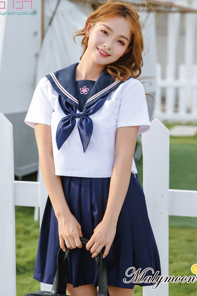 桜モチーフの校章が本格的♪紺×白のミニ丈半袖セーラー服コスプレ。