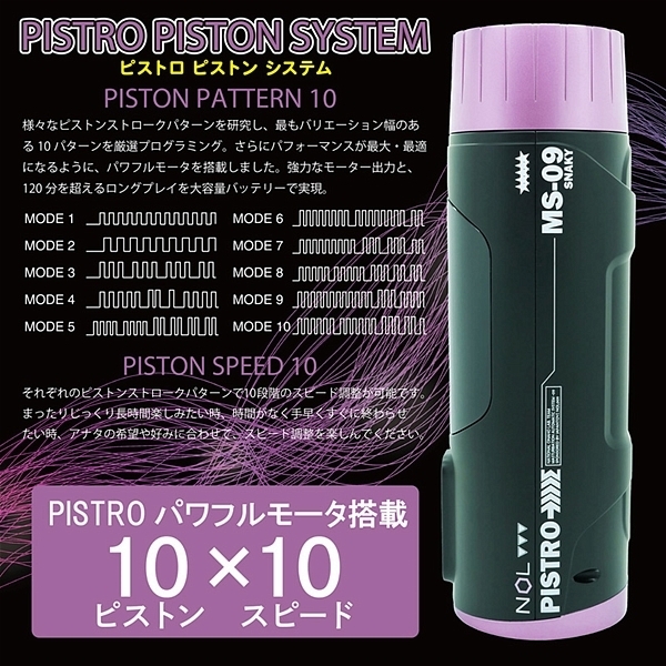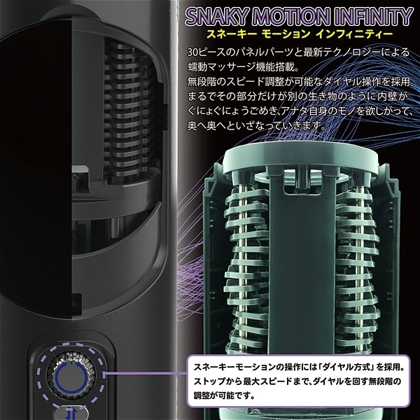 <特徴>・わかりやすい簡単操作の「コントロールパネル」・ピストンパターンは選べる「10種類」・ピストンスピードはローからスーパーハイまで「10種類」・うごめくスネーキーモーションはダイヤル操作で「無段階」のスピード調整が可能・インナーホールを温めるホットヒーターパネルで「ひと肌温度」再現・強力なピストンと繊細な作動を可能にする「内蔵パワフルモーター」・最大300分の動作が可能な「大容量バッテリー搭載」・お手軽な「USB充電」