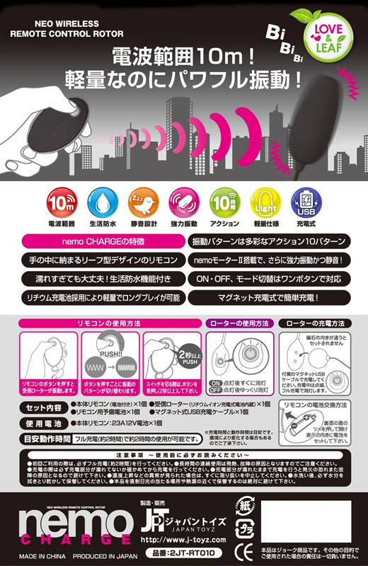 ●便利なUSB充電式●手の中に収まるリーフ型リモコン●約10mの距離まで遠隔操作可能●多彩な10種類の振動を搭載●電源ON/OFF&振動切替え・ワンタッチボタンで対応●ON→点灯後すぐ消灯・OFF→点灯後ゆっくり消灯●静音設計&生活防水仕様●2時間充電で約120分の連続稼働。