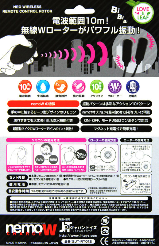 ●USB充電式・便利なマグネットタイプ●受信機は2時間の充電で約1時間稼動●生活防水仕様&静音設計●強力小型ローター(2個入り)●約10m先まで遠隔操作可能●10パターンのパワフル振動を搭載。