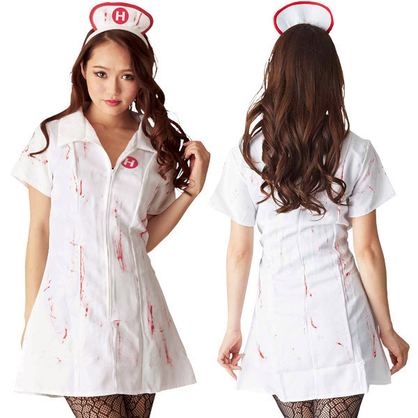 生々しい血しぶきを浴びた白衣の天使コスチューム!ハロウィンメイクの定番、ゾンビ風メイクにしてとことん楽しみたくなるホラーなアイテムです。